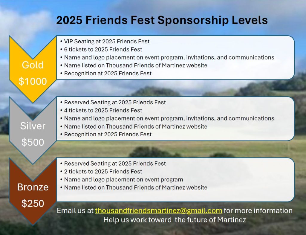 Thousand Friends was organized in 2015 as a political action committee with the number one goal of supporting better candidates to represent the public rather than just big-moneyed interests. This is our 5th election cycle. Thousand Friends of Martinez helps elect conscientious representatives; promotes open government; quality of life, parks, open spaces, and historic elements.