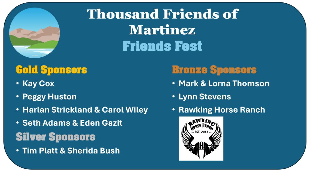 The Committee Against Martinez Redevelopment Agency (CAMRA) is the last group in a long line of Martinez groups and organizations that successfully fought the formation of a Martinez Redevelopment Agency. CAMRA is now shutting down and is making an unrestricted donation of its assets and legacy to Thousand Friends of Martinez (TFM) because TFM closely shares CAMRA’s long-standing goals to protect and preserve Martinez’s unique values, including its friendly, historic, small-town character and its natural connection with the hills and shoreline, open spaces and parks that are all around us.